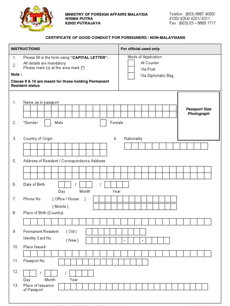Duration of stay in malaysia 4. A lot of applicants ask about how to get the certificate of good conduct for malaysia => australia work and holiday visa. Applicants residing in malaysia should submit their applications to the consular division, ministry of foreign affairs at the following address While all malaysian nationals can submit their applications unconditionally, foreign nationals who wish to apply for the cgc must fulfill a precondition that they had stayed in malaysia. This video provides you information related to obtaining a police clearance certificate (certificate of good conduct) in malaysia.