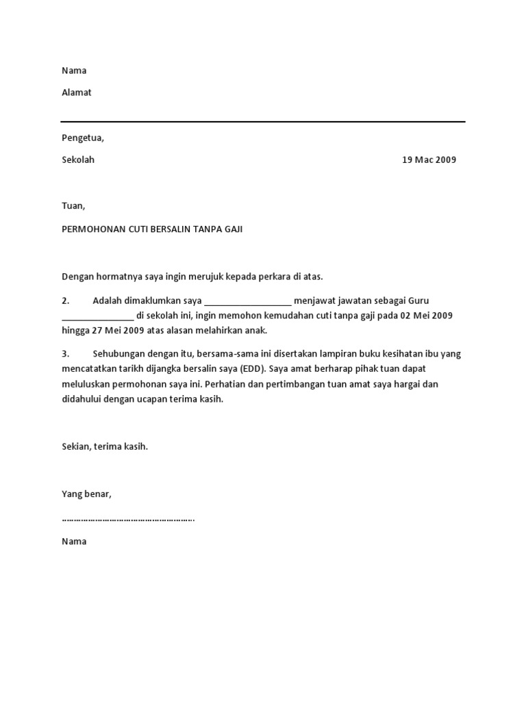 Maklumat hendaklah dilengkapkan dengan jelas dan menggunakan huruf besar. Prosedur apply cuti belajar separuh gaji bagi kakitangan cuti tanpa gaji selepas bersalin mashitah mamat surat permohonan cuti tanpa gaji urusan peribadi vrasmi Contoh notis cuti tanpa gaji. Cuti dapat diambil karena beberapa alasan seperti cuti karena sakit, cuti melahirkan atau cuti untuk liburan. 3.1 tarikh cutiyang jenis cuti dari hingga bil.