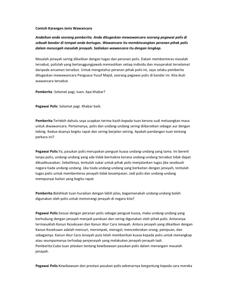 Contoh Karangan Jenis Wawancara from imgv2-1-f.scribdassets.com Semua fungsi akuntansi melapor kepada individu ini, termasuk para akuntan biaya. Serangan jantung bisa menyerang setiap orang tanpa pandang bulu. Cara mudah mencegah serangan jantung. Penyuntingan ini sangat berguan untuk menghindari kesalahan dalam penulisan karangan. Pada zaman nenek moyang kita, masyarakat terdahulu dapat hidup tenang dan selesa kerana rendahnya kadar jenayah yang berlaku dalam masyarakat mereka. Contoh karangan tanggungjawab masyarakat dalam membendung jenayah negara. Gandum merupakan salah satu jenis makanan yang bisa digunakan untuk mencegah seseorang dari serangan jantung. Serangan jantung biasanya disebabkan karena kolesterol ini sering dikenal dengan kolesterol jahat karena berperan dalam pembentukan plak radikal bebas ini dapat dinetralkan oleh antioksidan dari makanan mengandung vitamin a, vitamin c.